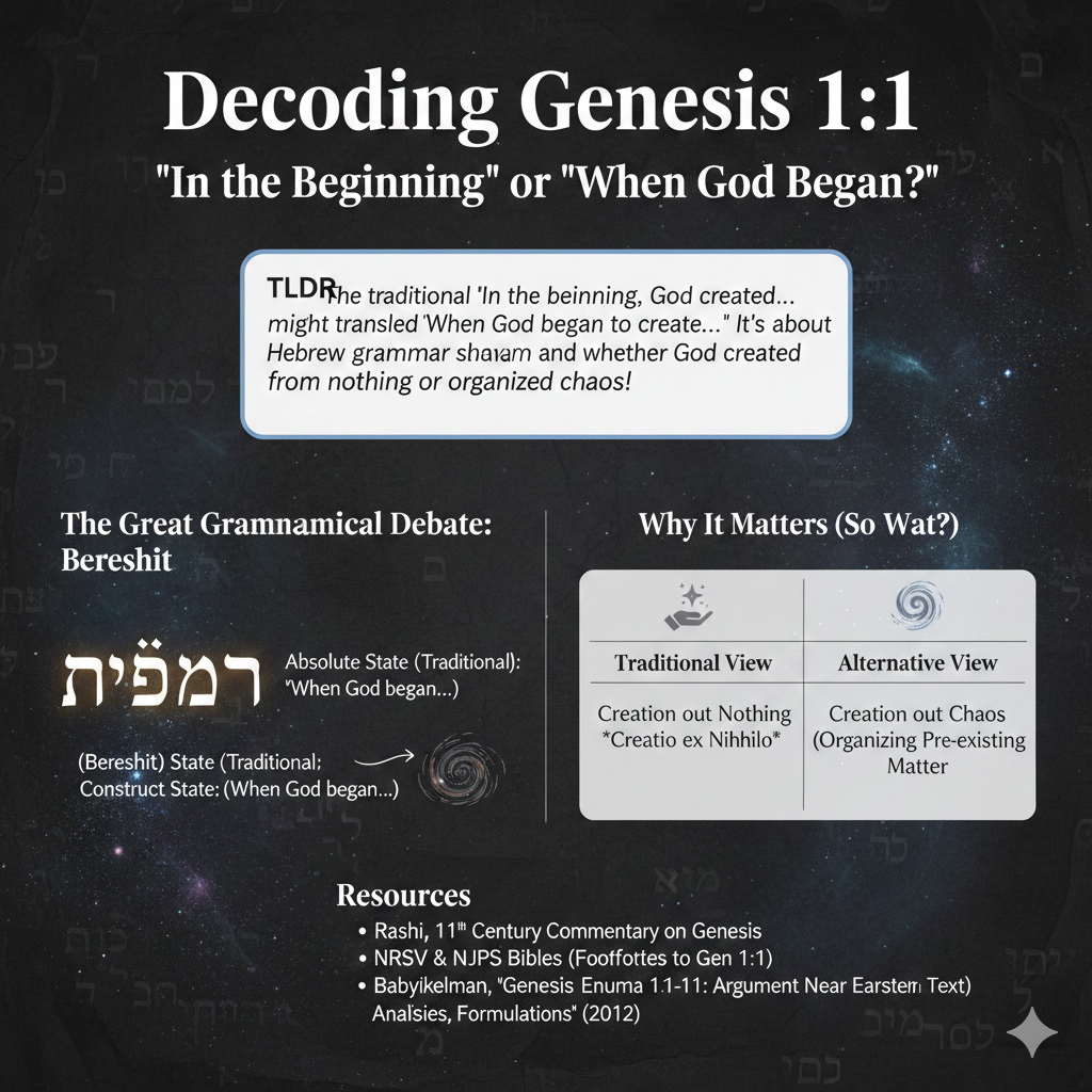 The very first word of the Bible, בְּרֵאשִׁית (Bereshit), is at the heart of this ancient puzzle. Scholars debate whether this word is in the "absolute state" or the "construct state."